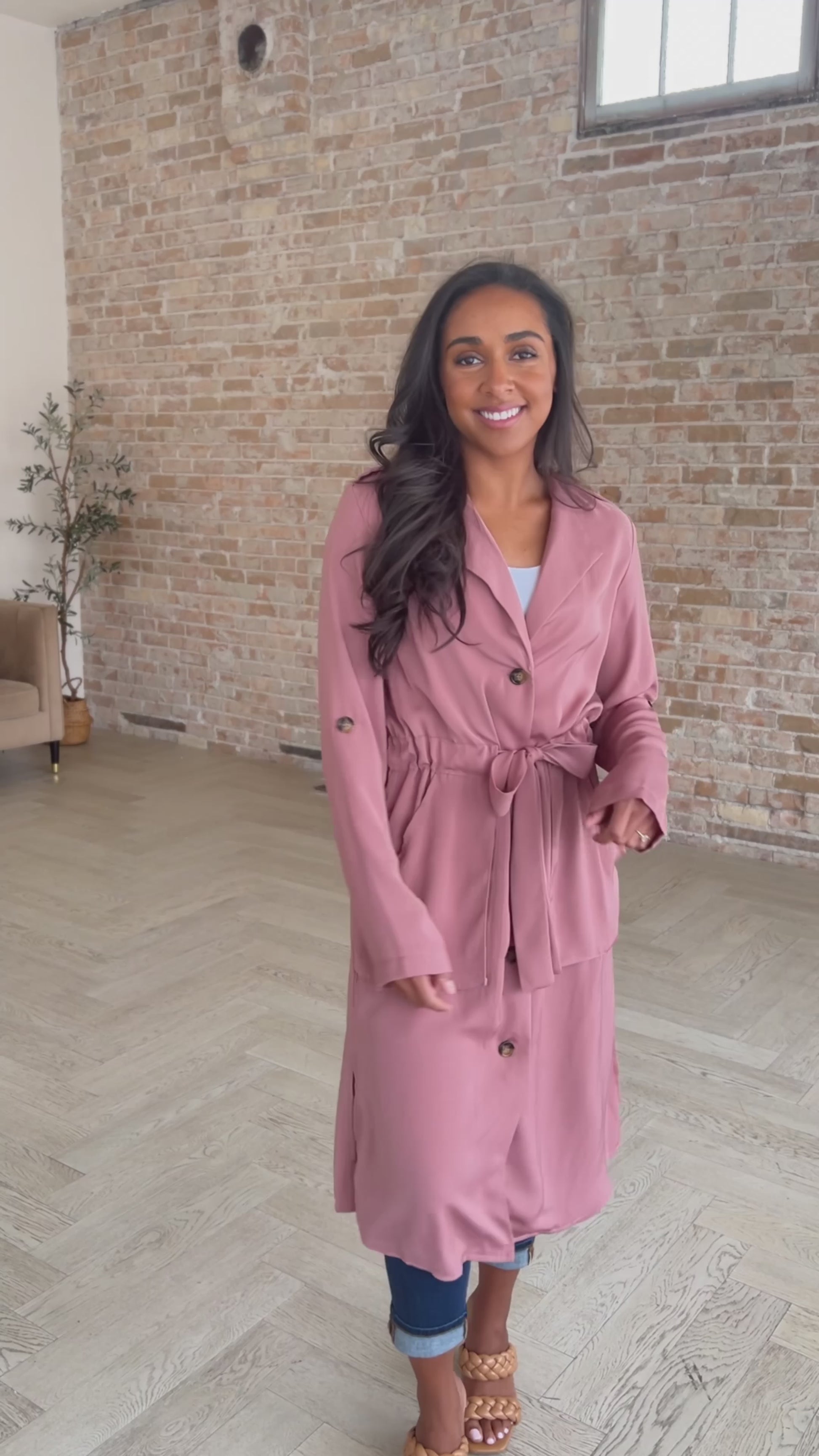 Fall in love with the First Day Of Spring Jacket In Dusty Mauve! Not only is the color absolute perfection, but the details are as well! Featuring a draped collar neckline, fully functional buttons, a cute waist tie, deep pockets, side slits, and roll tab sleeves. This lightweight jacket will pair well with all your spring essentials.